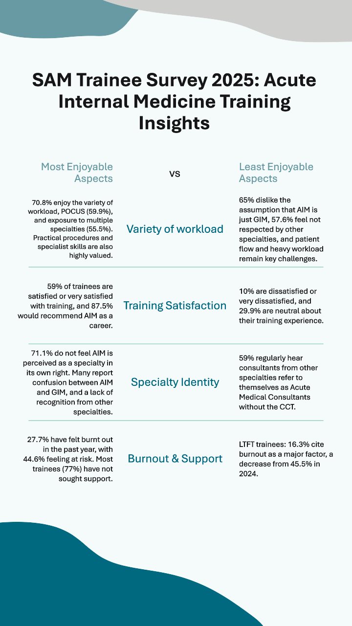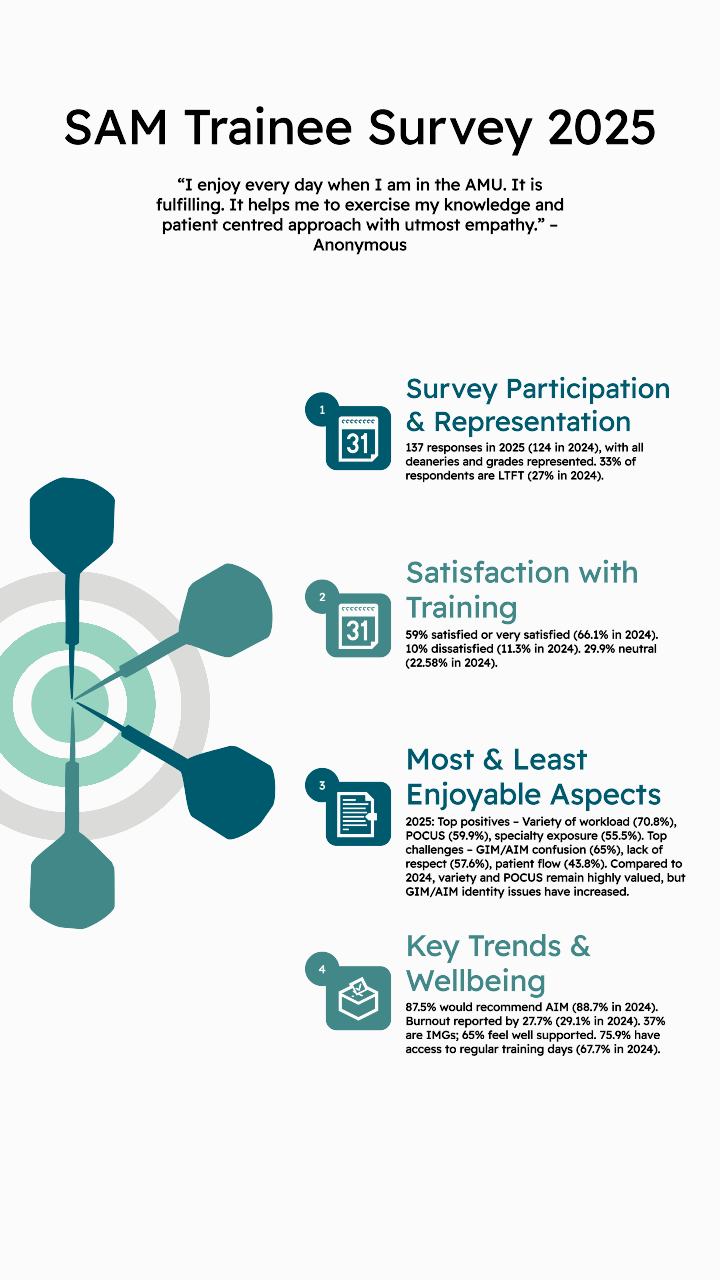 Every year, all resident doctors are asked to complete the National GMC survey. Whilst it does include some specialty or group specific questions the majority of data collected represents all respondents and it is difficult to gauge a true representation of training within Acute Medicine. The Society for Acute Medicine gives Acute Medical Higher Speciality Trainees the opportunity to complete their own specific survey. This in turn generates a report specific to Acute Medical training and can be used to guide Training Programme Directors and trainees on how best to improve their training, both locally and nationally.